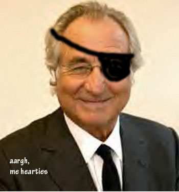 It’s fair to say that not even Bernie Madoff and his family will suffer a tiny peep compared with the starving Somali pirates’ families will experience when they are bombed back to the stone age (oops, they’re already there!). Wouldn’t it be a great idea for Madoff and the other Wall Street pirates to be exiled to Somalia where they can perform community service. They can help build a stable, fair government, like we have in the U.S.? Surely they’ll find much in common, spiritually, if not in tactics with their bretheren. Consider it a cultural exchange. The Americans will explain Derivitives, and the Somalis will demonstrate RPGS and AK-47s Prison furnished by Ritz Carlton, please.
