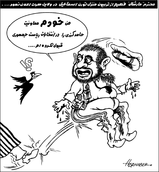 آمدن نه تنها مارشال صاحب فهیم صاحب چوکی گردید بلکه خود آقای کرزی نیز باکم دانیشی خود بالای شما مردم خوش بآور توسط امریکاهی ها قبولانده شد،اما اگر نتیجه گیری شود سباست مارشال چقدر کامیاب و مخفق است در طول هشت سال ار کابل گرفته تامزارشریف از بدخشان گرفته تا به بامیان جلال آباد هرات و غورات شکر آرام و آرامی است مگر این آقای کرزی است که با نادانی و ناکامی پای خود راسخت نموده و تمام روز مانند سگ های وحشی مردم قندهار کنر شنوار و وزیرستان را به جنگ نا محلوم و بی حدف قتل عام می نماید، خوب هالا چی فایده از چوکی که مردم خود قندار شب و روز کشته و بی عزت می شود!و تو آغا مانند ملاٌ عمر یا ملاَ نصرلدین شکم گشنه و گوز برنجی میزنی