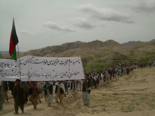تشکر از شبکه خبر رسانی کابل پرس? که اخبار جدید ودست اول راارائه میدهند. میخواهم به خبر جدید تان بیافزایم اینکه امروز تاریخ 8 ثور نیز درحدود 500 نفر که تقریبا20% شانرا زنان تشکیل میدهند به تعقیب خواسته های قبلی شان دست به تظاهرات صلح آمیز زده اند. اینان که از شهر نیلی (مرکز ولایت دایکندی ) تظاهرات راآغاز نموده اند با شعار های: شیرزاد خیانت کرد، والی حمایت کرد، مرگ بر خیانت کار، خیانت کار نمیخواهیم، ما حامی دولتیم، به طرف دفتر ولایتی یوناما وکمیسیون ولایتی حقوق بشر در حرکت شده اند که همینک 12:30بعد ظهر پیش روی دفتر کمیسیون مستقل حقوق بشر هستند. تظاهرات کنندگان هنوز بررهایی زندانیان بیگناه شان و برکناری سلطان علی ارزگانی از مقام ولایت دایکندی پا فشاری مینمایند ومیگویند تا دولت مرکزی به خواسته های ایشان وقع نگذارد به تظاهرات وتحصن خویش ادامه خواهند داد.