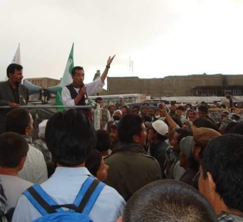 اگر میخواهید از آتش جنگ و بدبختی نجات یابید به این فرزند وطن از قوم رنج کشیده ی هزاره رای دهید که درد شما را با تمام پوست و گوشت درک کرده است و از جانب دیگر میداند که عدالت اسلامی و مساوات در پیشگاه قانون اساسی یعنی چه؟