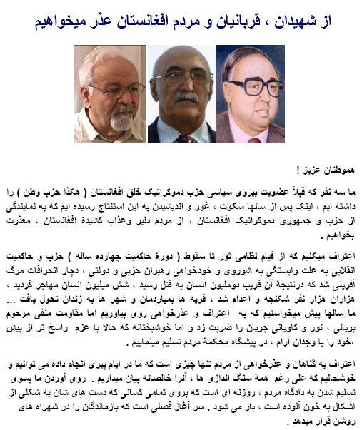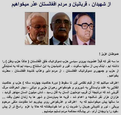 به ادامه آنچه که در بالا نوشته ام، خواستم خدمات دوستان عرض بدارم که این سه رهبر حزب دموکراتیک خلق فراموش کرده اند که بگویند که اولین رهبر حزب که از مردم افغانستان به خاطر اشتباهات و جنایات صورت گرفته بوسیله حزب اش معذرت خواست داکتر نجیب الله بود. او در چندین محفل و سخنرانی گفته بود که " به جای نان ما به مردم گلوله دادیم، به جای لباس کفن و به جای خانه قبر".