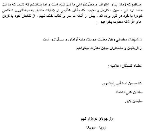اکادمیسین دستگیر پنجشیری، سلطان علی کشتمند و سلیمان لایق: میدانیم که زمان برای اعتراف و معذرت خواهی ما دیر شده است