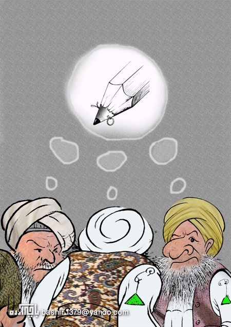 فکر میکنم ازین اگر واضح تر شود دیگه کاریکاتور نمیشه.این طرح خیلی زیبا بیان میکنه که آخند های نفهم که مغازه بنام (شورای علما)را افتتاح کرده از هر چه قلم و قلمدارو قلمچی است ترس داره خو باید هم بترسه زیرا اگر روشن فکران جامعه به میدان باشه نان آخند قات یعنی قطع میشود جانم.آخند ها از قلم به مثابه موشک و راکت هراس داره گلم.دیگه خواهش میکنم این متاع نفهمیدن خود را برخ ما بیچارا نکشین ترا خدا ! - بختیاری صاحب همیشه باشی و زنده باشی