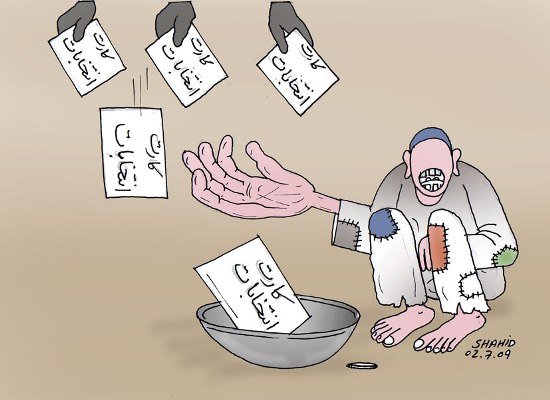 ایتو نمیشه آشنا جان / خوب میبینی که ما مردومی گوشنی اوغانیستان چشم نداریم . و از دیگه ایساسات محروم استیم . ما فقط پیسه ره میشناسیم پیسه ره . کتی کارتیت که پیسه نبود خاک ده سریت است . ما صبایما ره ام چورت نمیکونیم . ده غمی یک لوقمه نان استیم . نان هرکس چرب ترک بود ما کارت امو ره میگیریم و ده صندوق امو رای میپرتیم خدا بکونه که خاین باشه یا وطن فروش . پیسه پیسه نقد به نقد . پیسه بتی رای بگی . بی ازو ما میفامیم که صبا چه گپ میشه . و حال ما به نمیشه که نمیشه . کتی کارتیت لازم پیسه . باز صندوقیته نشان بتی که چشم پوت ده درونیش پرتیم . که استی چه استی چه میکونی ما کار نداریم . " ها " اگه تو ام مثل ما سوال گری میکونی برو بچیم که بیخار استی . از صبا تا بالی ده کجکول مه که پیسه انداخت که ده صندوق تو رای پرته ؟