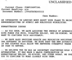 In September, 1996, as the Taliban cemented its control over Afghanistan and began its reign of terror in Kabul, the U.S. State Department sent several pages of memos spelling outs its desire to open good relations with the Talibs. They reveal a timid and naive powder-puff tone toward one of the most vicious regimes in history. Although some language indicates suspicions of the Talibs, the overall softness and phrases of encouragement seem quite inappropriate for the already well-demonstrated despotism of the Taliban regime.