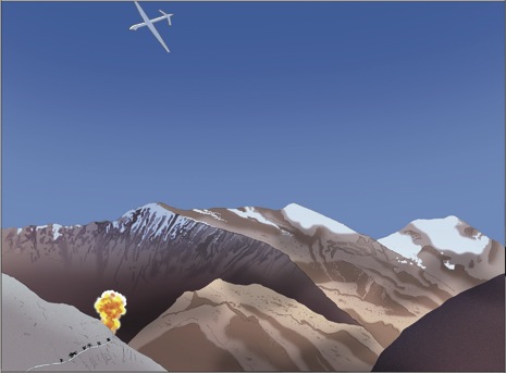 At approximately 3 p.m., the three villagers had climbed up on a bluff above the caves. They were at a height of about 3,300 meters. They were standing together in the open, chatting, when they were struck by at least one AGM - 114 Hellfire missile that had been fired by a CIA MQ-1 Predator drone. Two were killed instantly and the third died a short while later.