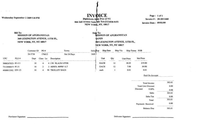 کابل پرس?: ورقه های رسید (فاکتور یا بیل) زیر نشان می دهد که در نمایندگی جمهوری اسلامی افغانستان به مديريت ظاهر طنین، در سازمان ملل مشروبات با درصد بالای الکل نوشیده می شود. با توجه به معلومات درج شده در این رسید ها، مواد الکلی به نمایندگی افغانستان در سازمان ملل متحد فرستاده شده است. در يکی از اين رسید ها نام ظاهر طنین نماینده ی دایم افغانستان در سازمان ملل متحد آمده است. مشروبات الکلی سفارش داده شده از انواع مختلف می باشد. شراب، ويسکی و ودکا. تاکید می شود که این مشروبات الکلی به نام نمایندگی افغانستان در سازمان ملل می باشد به هیچ عنوان مورد شخصی نیست.