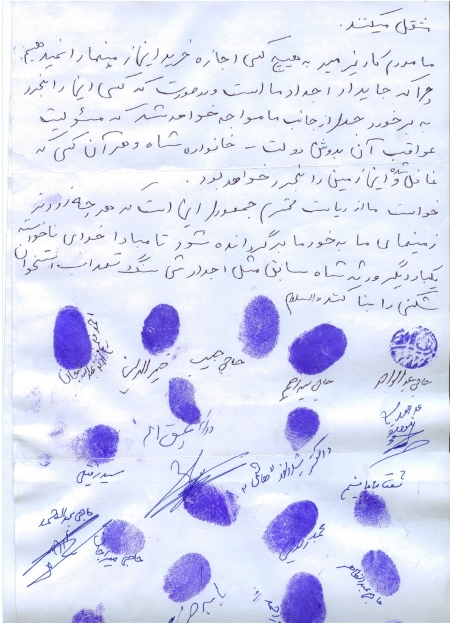 خواست ما از ریاست محترم جمهوری، این است که هرچه زودتر زمین های اجداد ما را به خودما برگردانده شود تا مبادا، خدا نا خواسته، یکبار دیگر، ورثه ی شاه سابق، مثل اجدادش، سنگ تهداب استخوان شکنی را بنا کنند.