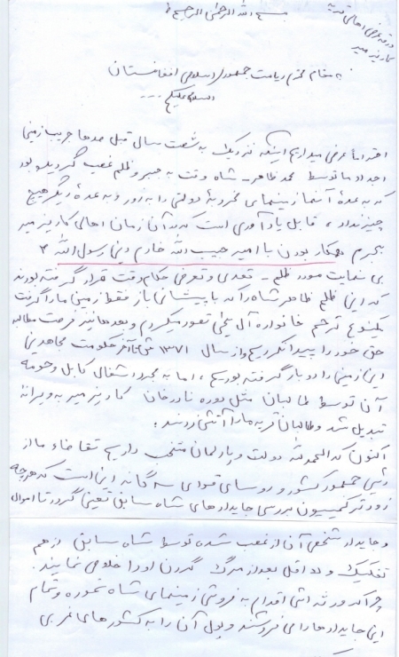 احتراماً عرض میداریم اینکه، نزدیک به 60 سال قبل، صد ها جریب زمین اجداد ما، توسط محمد ظاهر، شاه وقت، به جبر و ظلم، غصب گردیده بود که به عده ی آنها زمین های مخروبه ی دولتی را به زور و به عده ی دیگر، هیچ چیز نداد. قابل یاد آوری است که در آن زمان اهالی کاریز میر به جرم همکار بودن با امیر حبیب الله خادم دین رسول الله (ص)، بی نهایت مورد ظلم، تعدی و تعرض حکام وقت، قرار گرفته بودند که این ظلم ظاهر شاه را که با پیشانی باز فقط زمین ما را گرفت، یک نوع ترحم خانواده ی "آل یحیی" تصور می کردیم و بعد ها نییز، فرصت مطالبه ی حق خود را پیدا نکردیم. از سال 1371 ش. تا آخر حکومت مجاهدین، این زمین ها را دوباره گرفته بودیم؛ اما، به مجرد اشغال کابل و حومه ی آن توسط طالبان، مثل دوره ی نادر خان، کاریز میر به ویرانه تبدیل شد و طالبان قریه ی ما را آتش زدند.