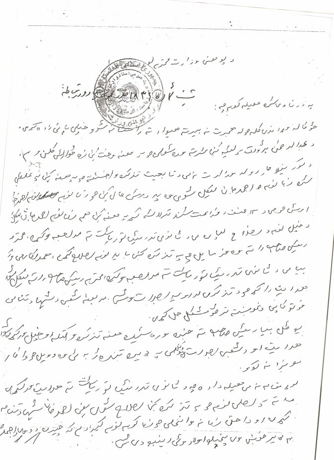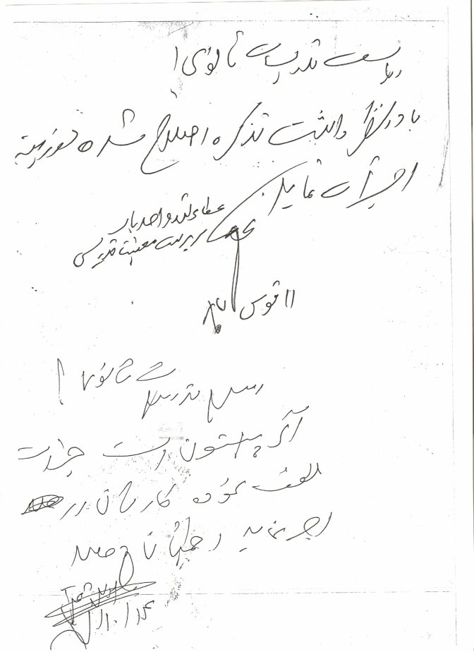 اوبیادرا ! به لیاظ خدا حکم وزیر بخانین ! گیرم که ملاحظه شد ره کورکورکانی قبول کونیم که ملاحظه شد اس ، باقی حکمه ولا که خر هم قبول نمی کنه ! ای بیسواد نوشته کده که : تائیدی کری دانقلاب اسلامی په حکم ! ازبرای خدا ، حکم انقلاب اسلامی اس که دروغ و جعل تائید شوه ! کوجاس حاجی صیب سرپلی که بیایه و از نام اسلام دفاع کنه ، اینی ره میگن چوب زدن ده کون اسلام که مجاهدین فی سبیل الله میزنن !