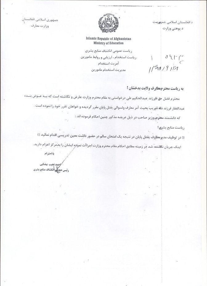 به اساس مطالعه سوابق عبدالغفار مدیر معارف یفتل پایان که به اساس بررسی هیات های تحقیق سوی استفاده نموده و در قضیه اختلاس مجرم شناخته شده و از وظیفه سبک دوش گردیده، دوباره به صفت مدیر معارف به اساس P.R.R قبلی معرفی شده نمی تواند.محترم فضل حق حکیمی که قبلاً به حیث سرپرست مدیریت معارف یفتل پایان اجرای وظیفه نموده، مجدداً معرفی گردد و پست ذکر شده به رقابت آزاد گذاشته شود، از اجراآت تان اطمینان دهید. محمد صدیق پتمن معین تدریسی و سرپرست وزارت معارف 21/10/1389
