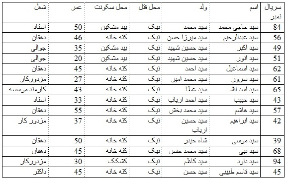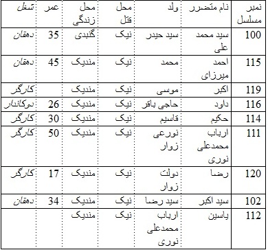 الف. (6): گرفتاری ها از قریه بید مشکین در جریان تلاشی خانه بخانه و قتل عام آنها توسط دسته قاتلین در نیک در 8 ماه جنوری.