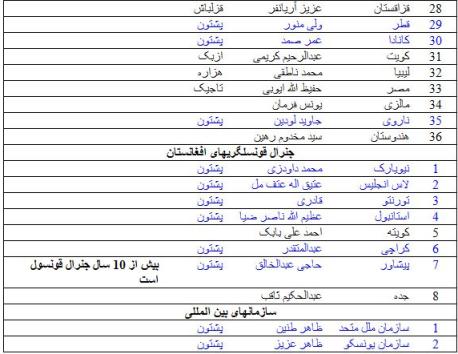 جدول سفرا و جنرال قونسلهای افغانی مقیم کشورهای مختلف جهان
