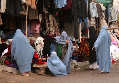 زنان در يک مارکيت شهر هرات البسه زمستانی می خرند.