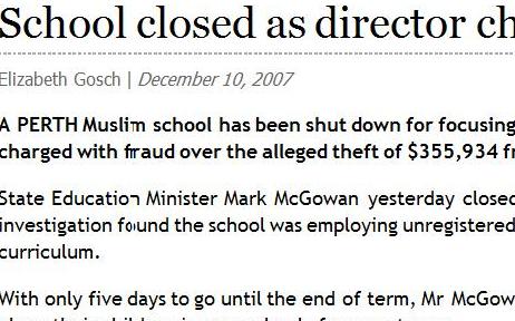 روزنامه ی " استراليا" در شماره ی چند روز پيش خود از مسدود شدن يک مدرسه ی اسلامی خبر داد. اين روزنامه نوشته است که مدير اين مدرسه متهم به دزدی و کلاهبرداری مبلغ سه صد و پنجاه و پنج هزار و نهصد و سی و چهار دالر می باشد. در اين مدرسه که يک مدرسه ی دخترانه ی اسلامی بود، آموزش بنيادگرايی داده می شد و با تعطيلی آن قرار است که شاگردان در مکاتب رسمی جايگزين شوند. مدير اين مدرسه سيد انور شاه نام دارد که پسر کاکای جنايات کار معروف عبدالرب رسول سياف می باشد.