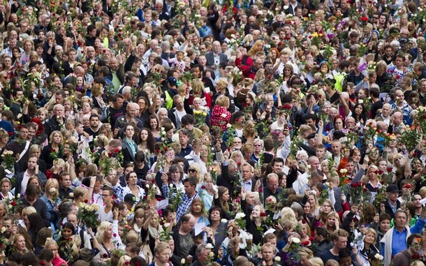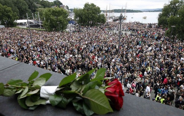 صدها هزار نروژی امروز در نقاط مختلف گرد هم آمدند و یاد ده ها تن کشته شده در روز 22 جولای را گرامی داشتند. آن ها در حالی که گل های رز در دست داشتند، آمده بودند تا بگویند دموکراسی آری، عشق آری، راسیسم نه. ینس استولتنبرگ صدر اعظم نروژ در جمع مردم گفت که نروژ از 22 جولای به بعد تلاش خاص و بیشتری برای دموکراسی خواهد کرد. شاهزاده و ولیعهد نروژ گفت که امروز خیابان های نروژ از عشق پر است. او از مردم خواست تا گل های رز را در تمام خیابان های اسلو پخش کنند. يکی دیگر از مقامات گفت که ما اینجاییم تا به نژآدپرستی نه بگوییم. دوکراسی آری نژآدپرستی و راسیسم نه. يک نویسنده ی نروژی روی دیوار فیس بوک خود نوشته که ما مردم نروژ به خیابان ها می رویم تا نشان دهیم ما همه برای حمایت از آنچه تروریست نروژی علیه آن است آماده هستیم.