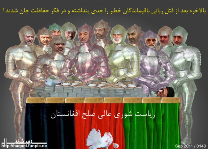به نظر من این نوشته بسیار به حقیقت نزدیک است . ربانی یک قاتل وطن فروش نوکر پاکستان بود و حمید کرزی نوکر سی آی است و باقی عبدالله عبدالله و قسیم فهیم از جمله بی سودان و کلکانی های هستند که به مشکل میتوانند از سواد اجتماعی حرف یزنند . اخر در بین این جماعتی که به زور بر مسند نشسته اند طالبان میخواهند که باید اینها بروند و وقت خوردن دالرانها رسیده است . این همه دزد ها بر سر دالر میجنگند . و در این میان طالبان را پاکستان به وطن فروشی به نام اسلام وادار نموده است و کرزی را به نام تمدن سی آی ای پیش انداخته است . این تولی وطن فروش و دزد و بی سواد هیچ کدام حد اقل اگر شرم و خجالت حبیب الله دزد کلکان را هم میداشتند باز به فایده مردم افغانستان بود . به هر حال و به هرنوعی که است اسلام نیز از این بی سواد ها را خر ساخته است . یکی را برای وطن فروشی به بهشت میفرستد و دیگری را برای ناموس فروشی . حالا تا وقتی که ما زیر دین شاشی شتر خوران یعنی عربهای تازی هستیم از ازادی و صلح خبری نخواهد بود . پس اول باید اسلام را از این کشور به زور سوته بیرون راند تا از پشتون ها شتر و از شمالی وار ها اسپ و از هزاره ها گوسفند نسازد . موقعی که همه مردم افغانستان بعد از بیرون انداختن یونیفارم اسلام به انسان تبدیل شدند . روز دوم همه کشور در صلح خواهد بود و ترقی شروع خواهد شد . تف بروی ربانی و تف بروی خلیلی و قانونی که برای روح این دزد و نوکر پاکستان در عقب سیاف که افشار را سوختانده بود نماز جنازه خواندن . ببینید شما که همه دزد ها در نماز جنازه یک دزد و وطن فروش به مقابل خدای که همه چیز به اشاره او انجام میابد حتی ادم کشی و زنا و هر چه جنایت است در جامعه بشری ؛ ایستاده بودند . افغان ها عبرت بگیرید و بیاموزید از این صحنه ها .
