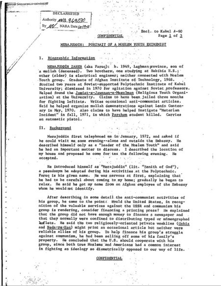 شخص نامبرده که نام" معراج الدین" را در زمان فعالیت های سیاسی در پولی تخنیک به خود داده بوده و به نام "فاروق" نیز یاد می شده است, اولین بار در جنوری 1972 با کارمند سیا در سفارت آنوقت امریکا در کابل ملاقات کرده و در اولین ملاقات بعد از برشمردن فعالیت های ضد کمونستی گروپ جمعیت جوانان مسلمان افغانستان, از مبارزه مشترک امریکا و مسلمانان بر علیه شوروی سابق یاد آوری نموده و خواهان کمک مالی بخاطر نشر یک جریده که افکار جمعیت جوانان مسلمان افغانستان را انعکاس دهد, شده است. "معراج الدین" هر چند از موجودیت دو جریدهِ هفته گی بنام های "گهیز" و" ندای حق" که افکار ضد کمونستی را انعکاس میدهند, یادآوری نموده است, فقط آنها را غیر قابل اعتماد برای گروپ خود دانسته و به شدت طالب کمک مالی شده است. پاسخ سفارت امریکا به آقای" معراج الدین" هم از نوع همان پاسخ های بوده که امریکا در تماس اول به همه ی نوکرانش در کشور های جهان سوم داده است. یعنی با در نظر داشت این که کمک مالی مستقیم به شکل دیپلوماتیک آن رد شده است, از نامبرده خواهش شده است که به سازمان های کمک کننده امریکائی که در آن وقت در افغانستان فعالیت داشته اند, مراجعه کند. همچنان در راپور آمده است " که بنابر علاقه و سمپاتیء که به فعالیت های گروپ جمعیت جوانان مسلمان افغانستان وجود داشت, و بخاط اینکه ارتباط ما دوام دار بوده باشد. جواب بخاطر کمک های مالی را به ملاقات های بعدی موکول کردم."