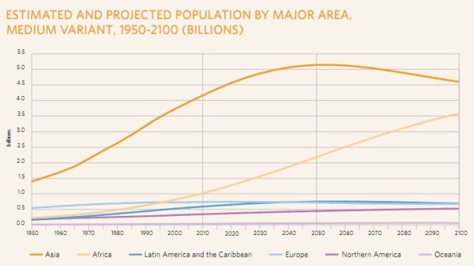 طبق پیش بینی های صندوق جمعیت سازمان ملل، رشد جمعیت در فاصله سال های 1950 تا 2100 در آسیا و سپس آفریقا بیشتر از سایر نقاط جهان است. این پیش بینی حاکی از آن است که جمعیت آسیا در 2050 بالغ بر پنج میلیارد خواهد شد و جمعیت آفریقا از مرز دو میلیارد عبور خواهد کرد. طبق این پیش بینی، جمعیت در کشورهای اروپایی و آمریکایی به شمول آمریکای لاتین از دو میلیارد تن در سال 2050 عبور نخواهد کرد.