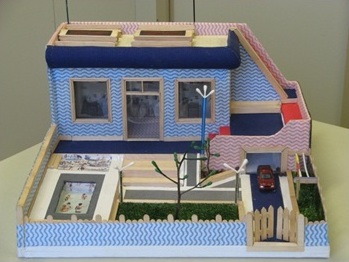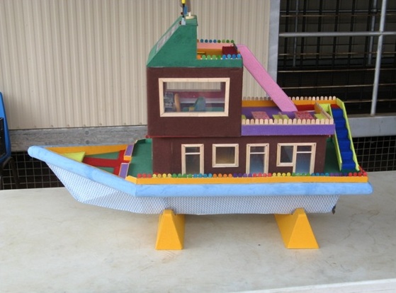 His other exhibit, My dream house is a combination of a traditional home in Afghanistan and an Australian home complete with swimming pool, car,garage, towels on the clothes line, neat grass and people inside. Made from balsa wood, dishcloths, felt, icy pole and matchsticks and plastic, all recycled here to astonishing effect. Trees made from earbuds. Rooftop picnic tables with Afghan carpets . Like the Dream Boat many hours of precise positioning of small objects and a complex level of juxtaposition certainly won over the hearts of many small children at the event who could relate to the narrative at work in the model. Home ownership may be still part of the Australian dream for some, and that certainly includes Hazara asylum seekers who risk their lives in boats to come here in the hope of one day bringing their wives and children to settle in a safe country where the opportunity of literacy and a life without violence is golden. One can only imagine a real life scale model of a house for Mr Javadi and his family in the future as an Australian resident with incredible skills to offer our society.
