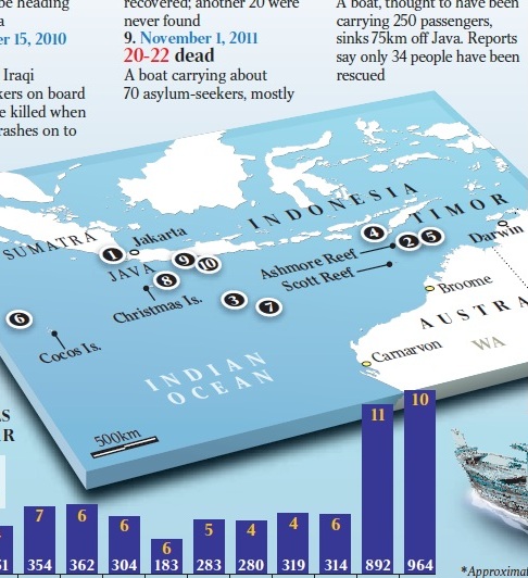 در همین حال برخی رسانه های استرالیایی با انتشار گرافی ، تعداد پناهجویان کشته شده در آب های اندونزی- استرالیا را از سال 2001 به این سو حدود هشتصد تن اعلام کرده اند. مرگبارترین حادثه در سال 19 اکتبر