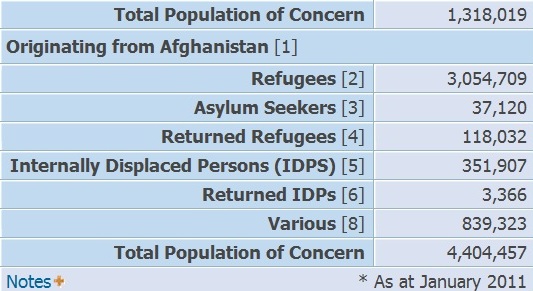 طبق آمار یو. ان. اچ. سی. آر تا ماه نخست سال 2011، 5 میلیون 54 هزار و 709 پناهنده افغانستانی وجود دارد و 37 هزار و 120 پناهجو. تعداد بی جای شدگان در داخل افغانستان نیز 351 هزار و 907 تن می باشد که به هیچ عنوان شامل همه بیجا شدگان بويژه قربانیان حملات کوچی طالبان نمی باشد.