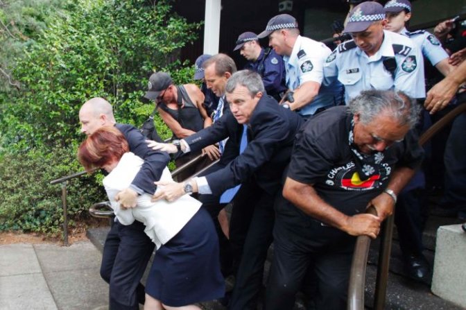 امروز عصر به وقت استرالیا، جولیا گیلارد صدراعظم استرالیا و تونی ابوت رهبر حزب لیبرال در پی خشم فعالان حقوق اقلیت ها، از کانبرا پا به فرار گذاشت. فعالان او را راسیست و نژادپرست می خوانند که دولت وی حقوق بومیان را نادیده می گیرد. مدافعان بومیان استرالیا در شعارهایشان می گفتند گیلارد را تا بندر یا میدان هوایی اسکورت کرده و او را به ولز برگردانید. منظور این فعالان این است که گیلارد خود مهاجری ست که از غرب اروپا به استرالیا آمده و با سیاست های راسیستی خود حقوق بومیان را نادیده می گیرد.
