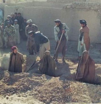 در این عکس که از یک فیلم گرفته شده، جنایتکاران طالب را نشان می دهد که برای سنگسار دو زن و یک مرد آماده می شوند.
